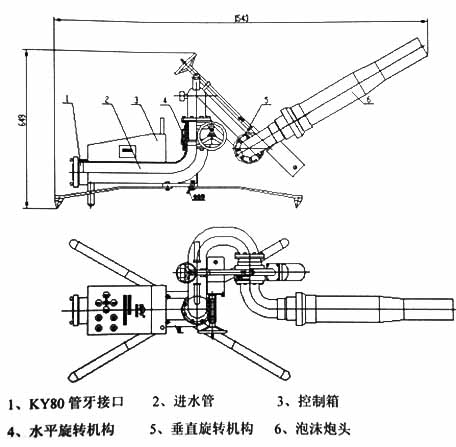 4、水平旋轉(zhuǎn)機(jī)構(gòu) 5、垂直旋轉(zhuǎn)機(jī)構(gòu) 6、泡沫炮頭